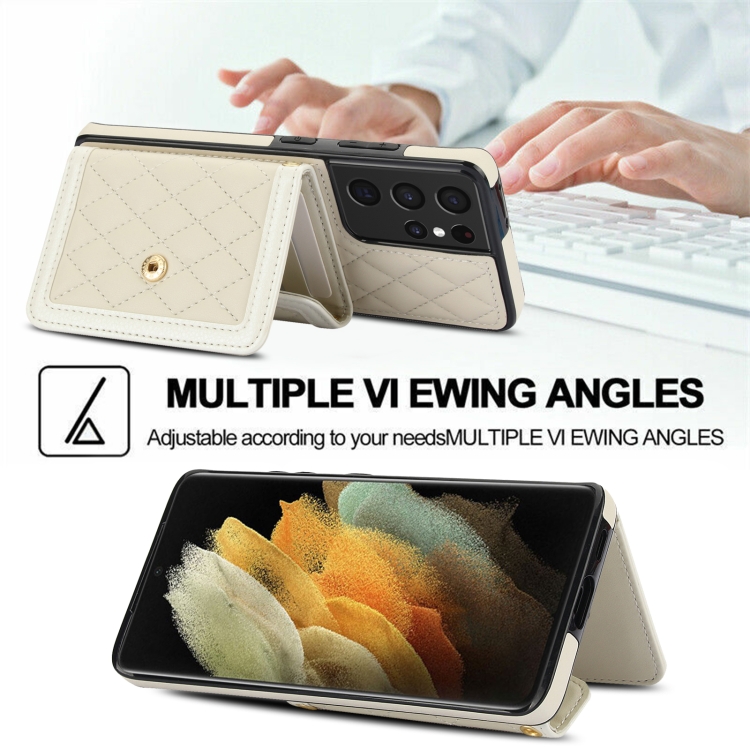 Estuche para Teléfono Samsung Galaxy S21 Ultra 5G con Bolsa para Tarjetas Textura Rómbica Empalme Cordón Largo (Beige)