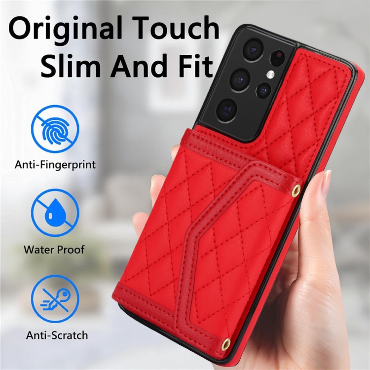 Estuche para teléfono Samsung Galaxy S21 Ultra 5G con bolsa para tarjetas textura rómbica y cordón largo (Rojo)