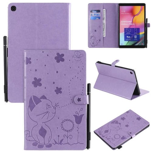 Funda protectora para Tablet Samsung Galaxy Tab A10.1 T510 (2019) Cuero con Patrón de Relieve Abeja Gato Soporte y Ranuras (Púrpura)