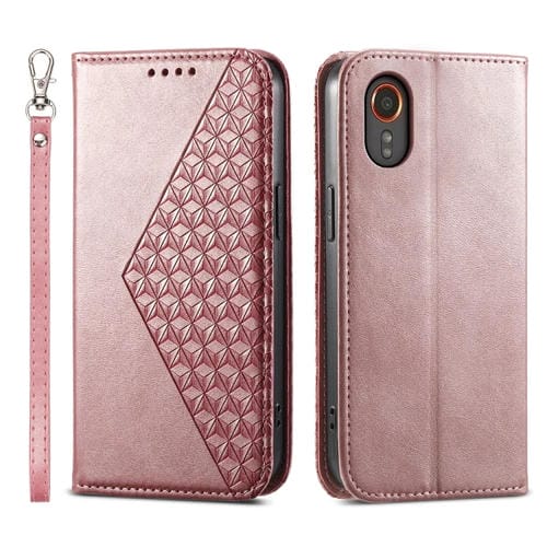 Funda para Teléfono Samsung Galaxy Xcover 7 Cuero Magnético Textura de Becerro Rejilla Cúbica (Oro Rosa)
