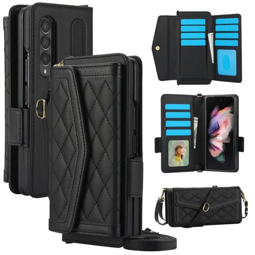 Estuche para teléfono Samsung Galaxy Z Fold4 con tarjetero textura rómbica y empalme con cordón (Negro)