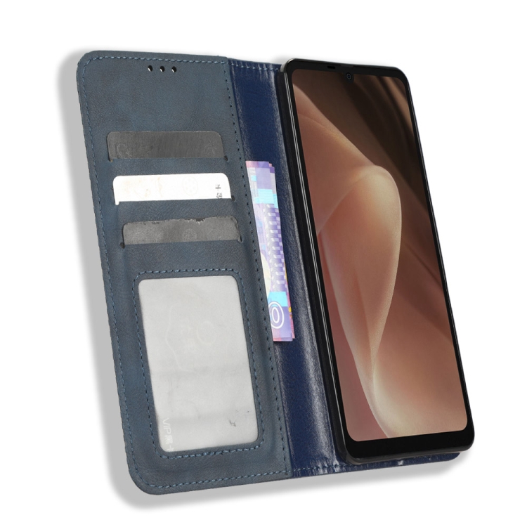 Funda de Cuero para Sharp Aquos Sense7 con Hebilla Magnética y Textura Retro (Azul)