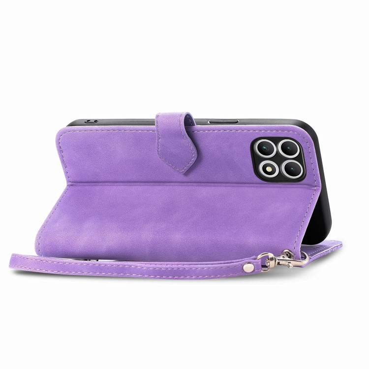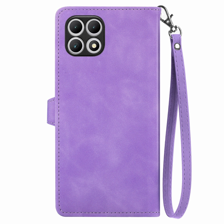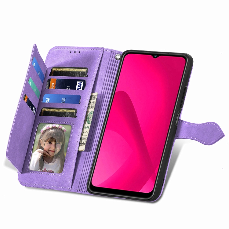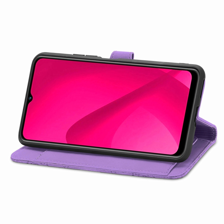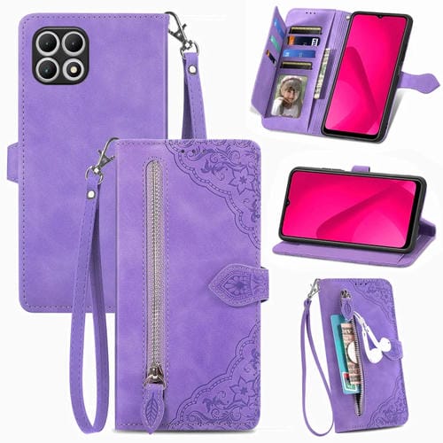 Funda de Cuero para T-Mobile Revvl 7 5G con Cremallera y Flor En Relieve (Púrpura)