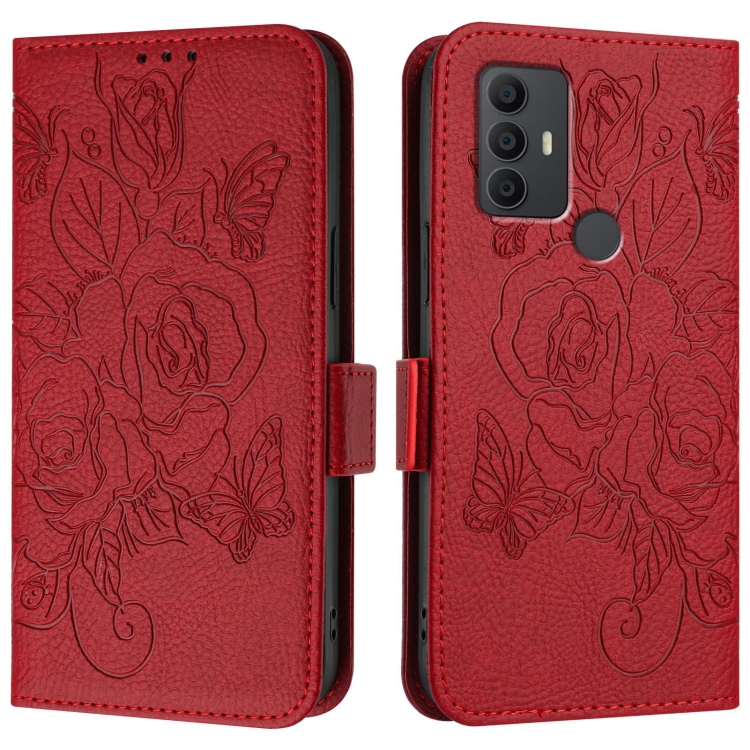Funda para Teléfono TCL 305/30 Cuero Antirrobo RFID con Rosa en Relieve (Rojo)