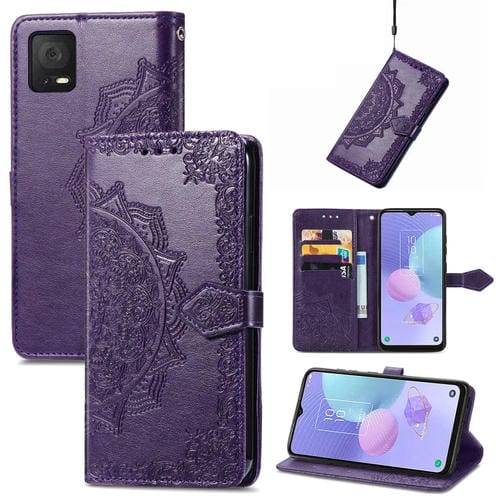 Funda de Cuero para TCL 405 Mandala Flower en Relieve (Púrpura)