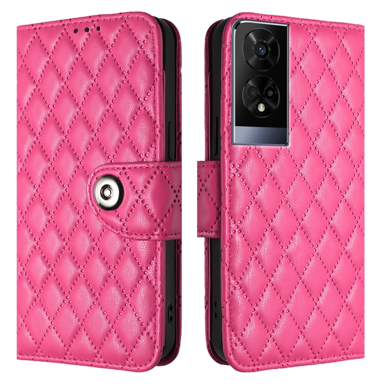 Funda para TCL 50 Xe 5G de Cuero con Tapa, Textura Romboidal y Cordón (Rojo Rosa)