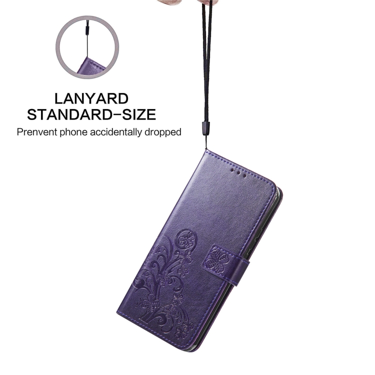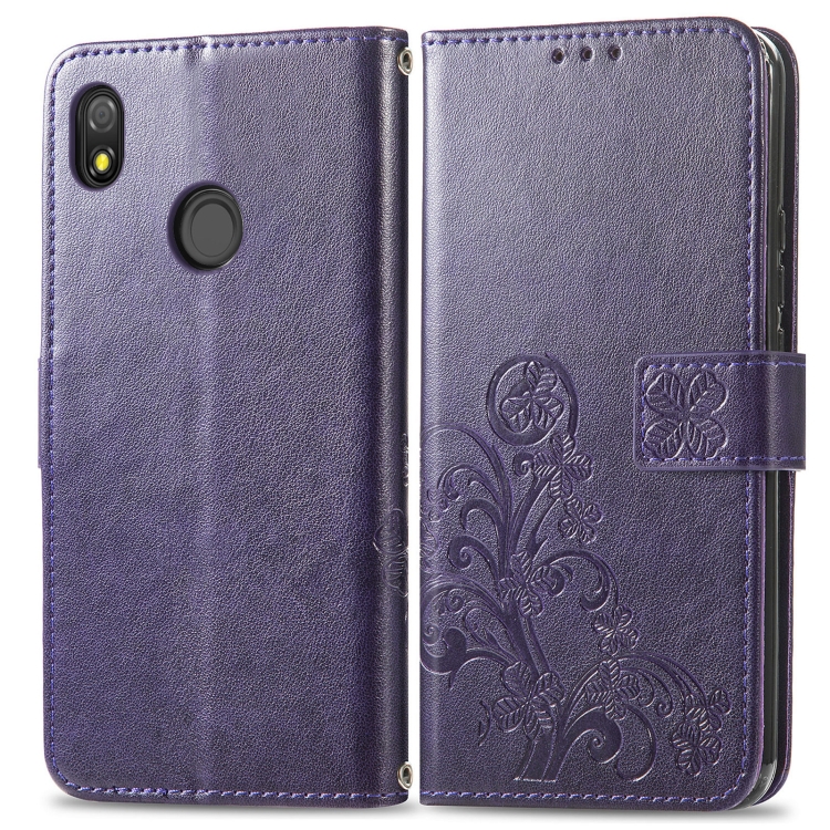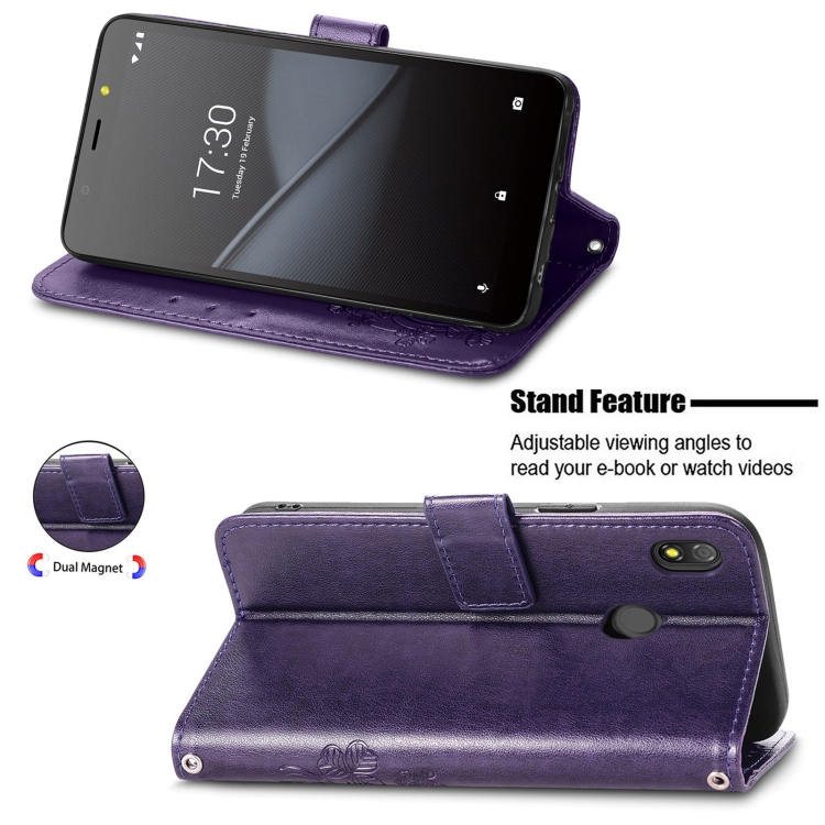 Funda de Cuero para Tecno Pop 3 con Cierre de Cuatro Hojas, Hebilla en Relieve, Ranura para Tarjeta y Función Soporte (Púrpura)
