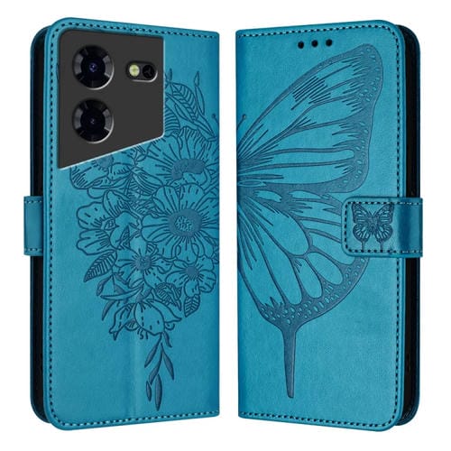 Funda de Cuero para Tecno Pova 5 Pro 5G con Mariposa en Relieve (Azul)