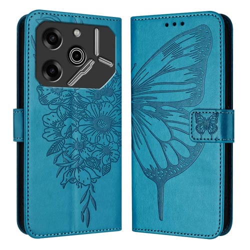 Funda de Cuero para Tecno Pova 6 Pro con Mariposa en Relieve (Azul)