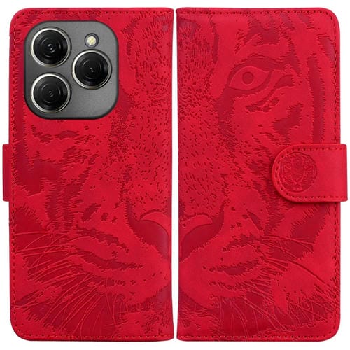 Funda de Cuero para Tecno Spark 20 Pro con Tapa y Patrón Tiger en Relieve (Rojo)