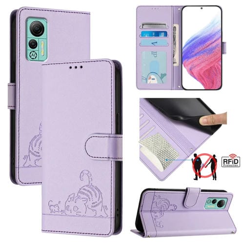 Funda para Ulefone Note 14 Cat Rat de Cuero RFID con Patrón en Relieve y Cordón (Púrpura)