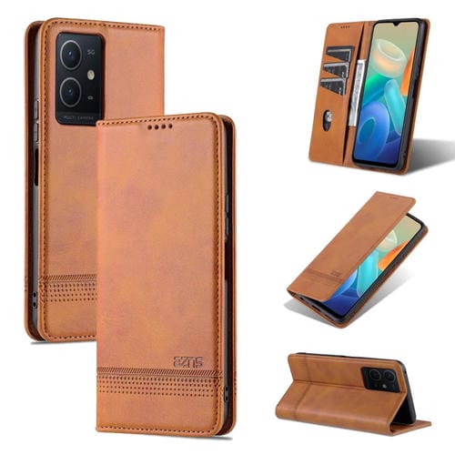 Para Vivo Y33S 5G / Y75 5G Azns Texture Magnética Texture Telea de Cuero de Cuero (Marrón Claro)
