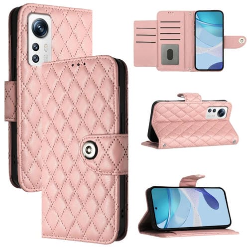 Para Xiaomi 12/12X / 12S Funda para Teléfono de Cuero con Tapa con Textura Rómbica y Cordón (Rosa Coral)