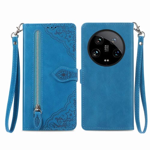 Para Xiaomi 14 Funda De Cuero Con Cremallera Y Flores En Relieve Ultra (Azul)
