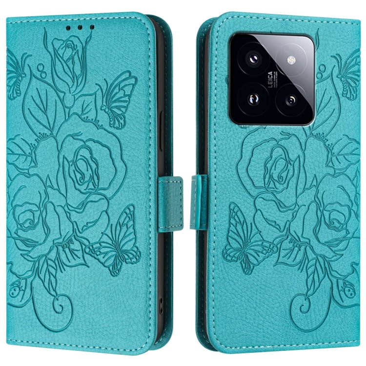 Para Xiaomi 14 Pro 5G Funda De Teléfono De Cuero Antirrobo Rfid Con Relieve Rosa (Azul Claro)