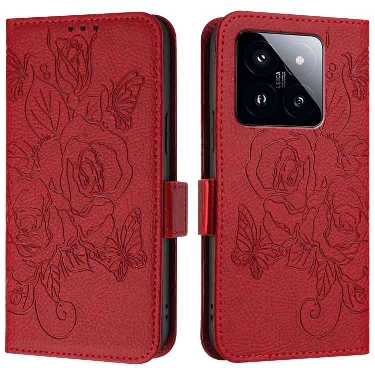 Para Xiaomi 14 Pro 5G Funda De Teléfono De Cuero Antirrobo Rfid Con Relieve Rosa (Rojo)