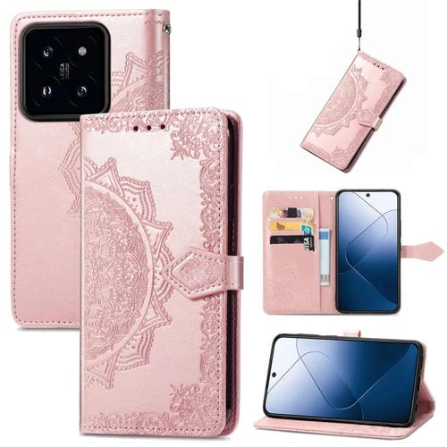 Para Xiaomi 14 Pro Mandala Flower Funda De Teléfono De Cuero En Relieve (Oro Rosa)