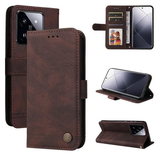 Para Xiaomi 14 Pro Skin Feel Life Tree Funda De Cuero Con Botón De Metal Para Teléfono (Marrón)