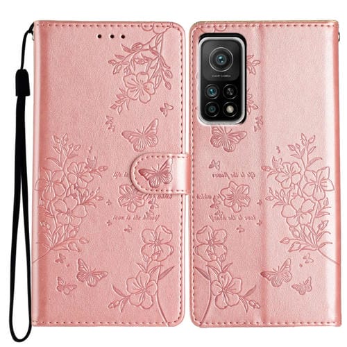 Para Xiaomi Mi 10T Pro 5G Funda de Cuero para Teléfono con Mariposas y Flores (Oro Rosa)