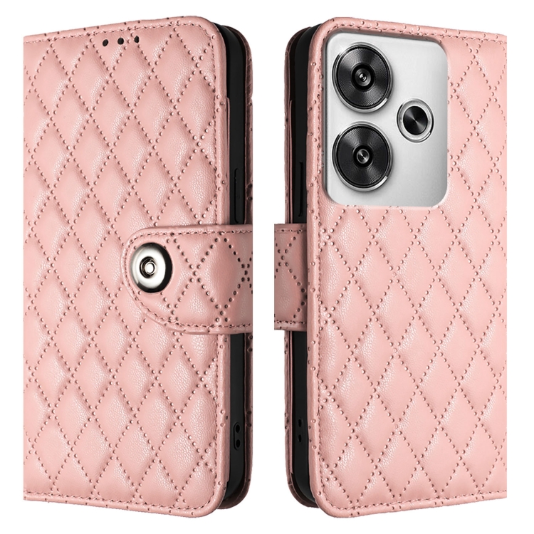 Para Xiaomi Poco F6 5G Funda para Teléfono con Tapa de Cuero con Textura Romboidal y Cordón (Rosa Coral)