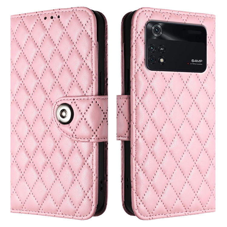 Para Xiaomi Poco M4 Pro 4G Funda de Cuero con Tapa con Textura Romboidal y Cordón (Rosa)