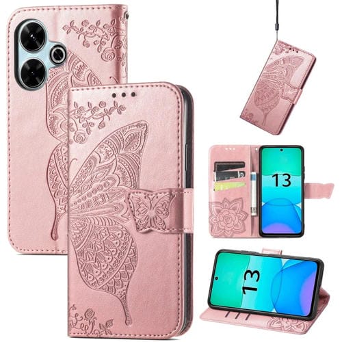 Para Xiaomi Redmi 13 4G Butterfly Love Flower Funda de Cuero para Teléfono En Relieve (Oro Rosa)