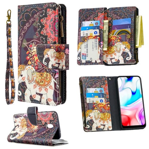 Para Xiaomi Redmi 8A Patrón de Dibujo de Colores Cremallera Funda de Cuero con Tapa Horizontal con Soporte y Ranuras para Tarjetas y Billetera (Elefantes de Flores)