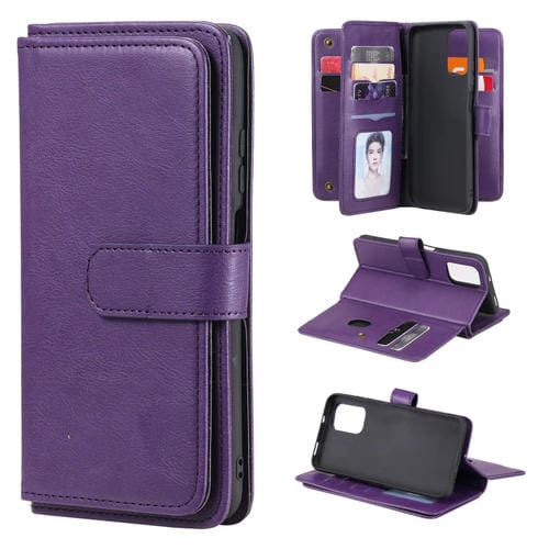 Para Xiaomi Redmi Note 10 4G Multifuncional Magnético Hebilla de Cobre Horizontal Flip Funda de Cuero de Color Sólido con 10 Ranuras para Tarjetas y Billetera y Soporte y Marco de Fotos (Púrpura)