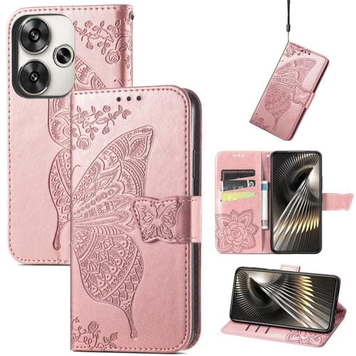 Para Xiaomi Redmi Turbo 3 5G Funda para Teléfono de Cuero con Relieve de Flor de Amor y Mariposa (Oro Rosa)