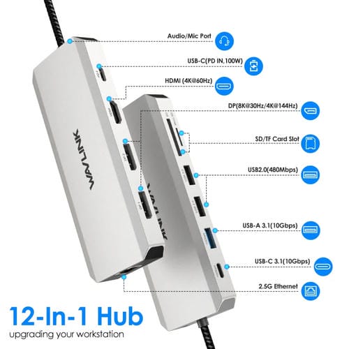 - 1x Adaptador MultiPuerto de Monitor Wavlink UMD306 Triple Dual 8K 12 en 1