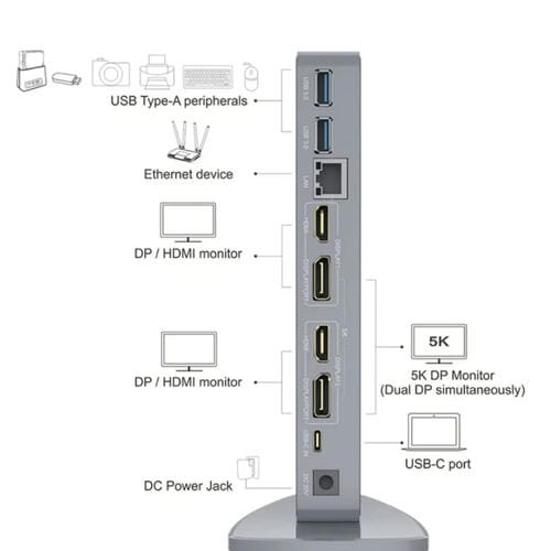 - Salida de video: 2 x DisplayPort 1.2 y 2 x HDMI 2.0; Soporte para Pantalla única 5K (5120x2880 a 60Hz) o Pantalla dual 4K (4096x2160 a 60Hz); 6 Puertos USB-A 3.0 con velocidades de hasta 5 Gbps; Puerto Gigabit Ethernet 10/100/1000 Mbps; Puerto USB-C ascendente; Conectores de CC y audio (Micrófono y Auriculares); Cable desmontable de 1 metro; dimensiones 150x80x200 mm; peso 450 g; Adaptador de Corriente DC 20V/2A